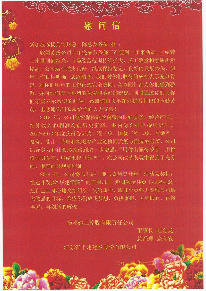 12月中上旬,公司總部完成了對國內(nèi)各區(qū)域公司的年終走訪調(diào)研。新加坡蘇揚公司則通過電子稿匯報了2013年工作情況及下年度工作思路。2013年新加坡蘇揚公司主要經(jīng)濟指標(biāo)創(chuàng)歷史新高;隊伍規(guī)模保持穩(wěn)定;班組承包責(zé)任制成果顯著;市場份額持續(xù)擴大。總部認(rèn)為這一年來蘇揚公司保質(zhì)態(tài),擴市場,穩(wěn)增長,取得了不俗成績,公司董事長陸金龍、總經(jīng)理宗有農(nóng)特發(fā)慰問信鼓勵蘇揚公司再接再厲,再創(chuàng)新高!