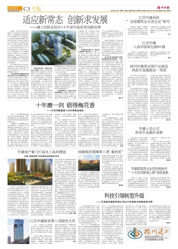 13日《揚州日報》刊發“揚州建工”專版 時間:2015-02-15 3445 2月13日《揚州日報》C3整版刊發“揚州建工”專版,主要包括《適應新常態 創新求發展——建工控股系統2014年逆市奮進再創新佳績》、《華建地產著力打造本土高尚樓盤》、江蘇華建再獲“全國建筑業先進企業”稱號等內容,歡迎關注當日《揚州日報》或網站http://www.yznews.com.cn/yzrb/html/2015-02/13/node_199.htm。