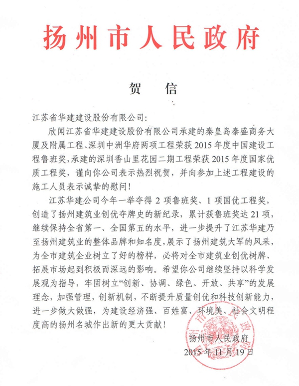 揚州市政府向江蘇華建發來賀信 祝賀一年內獲三項國家質量大獎