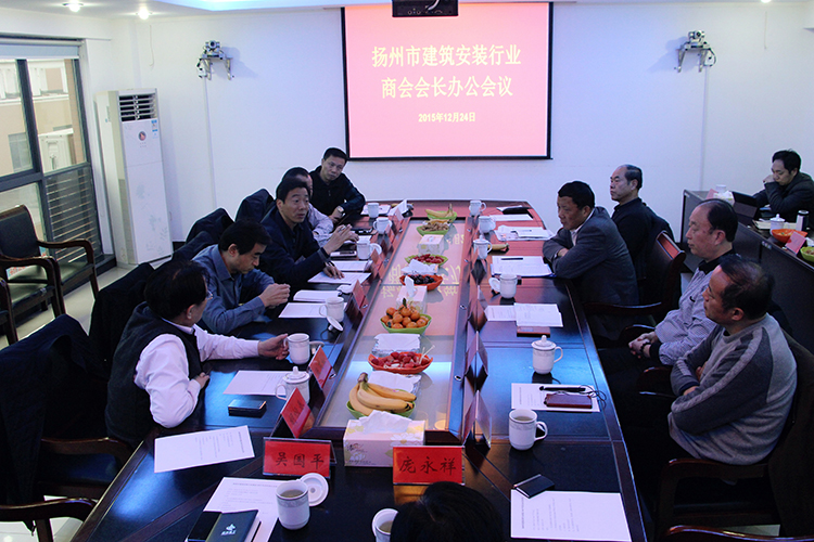12月24日下午,揚州市建筑安裝行業(yè)商會在江蘇滬武建設(shè)集團(tuán)會議室召開2015年度會長辦公會,陸金龍會長主持會議,各位副會長、秘書長參加會議,揚州市委統(tǒng)戰(zhàn)部副部長、市工商聯(lián)副主席兼黨組書記、市總商會副會長趙振東和市工商聯(lián)(總商會)會員處處長田德兵應(yīng)邀出席。