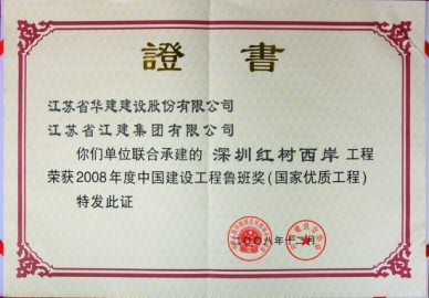 紅樹西岸工程位于深圳填海區(qū),由3棟31層的折線形塔樓組成,建筑高度99.2米,建筑面積33.4萬(wàn)平方米,3幢高層住宅樓呈“風(fēng)車”狀組合在大面積水景花園之中,既富現(xiàn)代氣息、又與自然環(huán)境和諧共生,是深圳灣畔極具標(biāo)志性的高尚住宅建筑。工程2003年10月20日開工, 2006年3月28日竣工,獲得2007年度深圳市優(yōu)質(zhì)工程、“金牛獎(jiǎng)”;2007年度江蘇省省外優(yōu)質(zhì)工程“揚(yáng)子杯”;2007年度廣東省優(yōu)良樣板工程、“金匠獎(jiǎng)”;2005年度深圳市優(yōu)質(zhì)結(jié)構(gòu)工程獎(jiǎng);2005年度深圳市新技術(shù)應(yīng)用示范工程第一名;2005年度江蘇省新技術(shù)應(yīng)用示范工程;2006年11月通過(guò)建設(shè)部第五批全國(guó)建筑業(yè)新技術(shù)應(yīng)用示范工程驗(yàn)收,“整體應(yīng)用水平達(dá)到國(guó)內(nèi)領(lǐng)先”;“控制隔音樓地面施工質(zhì)量”QC成果于2006年4月在江蘇省發(fā)布并榮獲成果一等獎(jiǎng),該項(xiàng)QC成果于2006年7月參加中建協(xié)組織的全國(guó)工程建設(shè)優(yōu)秀QC成果交流,小組榮獲2006年全國(guó)工程建設(shè)優(yōu)秀質(zhì)量管理小組稱號(hào);2008年11月榮獲魯班獎(jiǎng)。