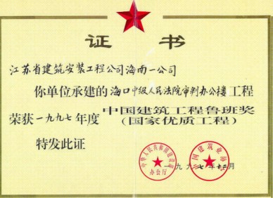 海口市中級人民法院審判辦公樓位于海口市金宇路8號,1995年4月竣工,1996年6月被評為海南省優質工程,并榮獲海南省優秀建筑二等獎,1997年12月榮獲1997年度建筑工程魯班獎。