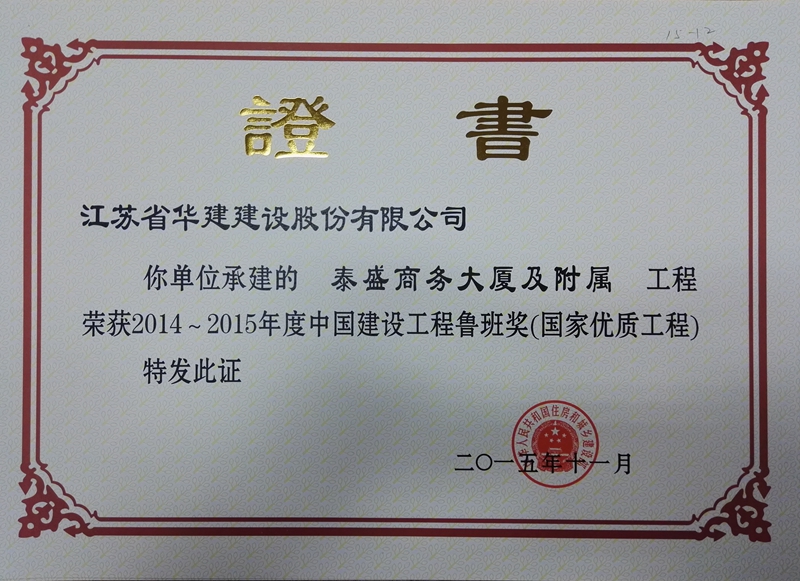 泰盛商務大廈及附屬工程地處秦皇島市經濟開發區核心位置,集商務辦公、會議中心、一站式服務大廳及報告演藝廳等功能為一體的綜合類商務辦公樓,地下1層,地上23層,裙樓兩層,建筑面積90148㎡,建筑高度97.75米。工程先后榮獲全國建筑業綠色施工示范工程、江蘇省新技術應用示范工程、江蘇省省級工法、河北省結構優質工程獎、河北省建設工程安濟杯獎(省優)、全國優秀項目管理成果獎、全國優秀QC小組成果一等獎。2015年,被中建協評為2014-2015年度中國建設工程魯班獎(國家優質工程)。