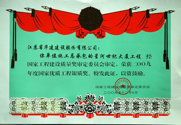 星河世紀大廈 時間:2010-01-19 8344 該工程位于深圳市福田區深南大道南與彩田路西交匯處,是深圳市中心區東門標志性建筑。該工程一裙三塔,32-39層,高173.2米,總建筑面積156680平方米,是集辦公、商業、住宅為一體的綜合樓。 該工程先后榮獲2006年度“深圳市安全生產文明施工優良工地”、2007年度深圳市優質工程“金牛獎”第一名、2007年度廣東省優良樣板工程獎、2007年度江蘇省“揚子杯”省外優質工程獎,2009年12月被評為2009年度國家優質工程銀質獎。